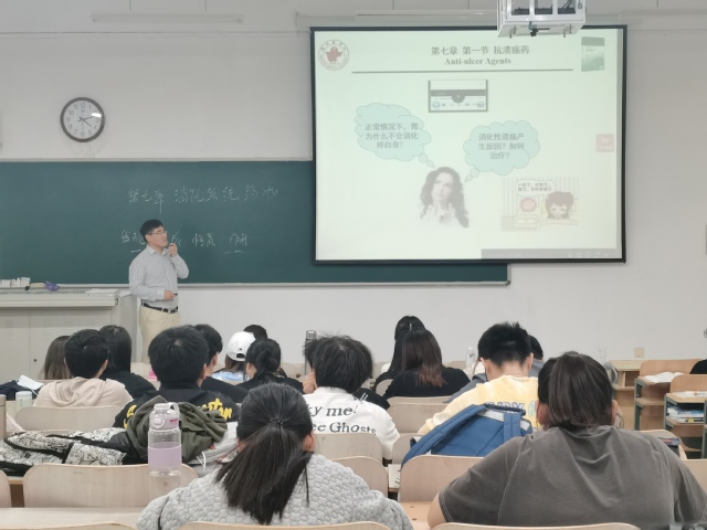 贾海永以“什么是药物化学”“什么是消化系统”为题带领全体同学进入对《消化系统药物》的探索旅途。课程坚持“以学生发展为中心”的理念,采用移动互联网背景下智慧课堂的PBL+翻转课堂教学模式,引入教学视频和案例,以互动讨论的形式,巩固前面学习的知识,提高学生思考和解决问题的能力,加深学生对课程内容的理解和应用。课堂引入新药研发成果,激发学生对新药创新的兴趣,引导学生勤动脑多思考,培养科学思维和创新意识。