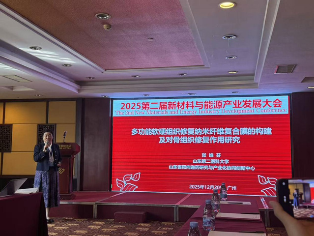 2025年12月20日,第二届新材料与能源产业发展大会在广州隆重举办。本次大会汇聚了来自国内上百所高校及科研机构的专家学者,围绕新材料设计、能源转换及储存等前沿领域展开了深入研讨。山东第二医科大学张维芬教授应邀率团队参会,并作分会主席及特邀报告,展示了在该领域的创新研究成果,并与国内同行进行了深入交流。